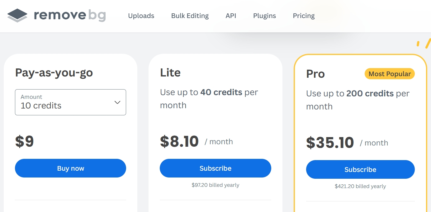 remove.bg offers two pricing options: pay-as-you-go and subscription.